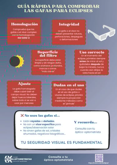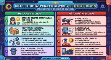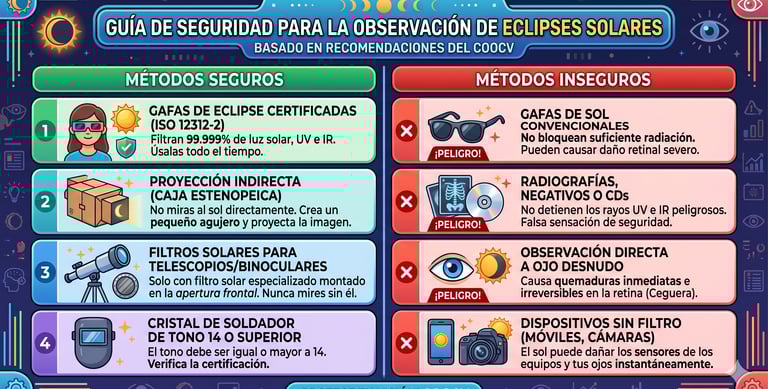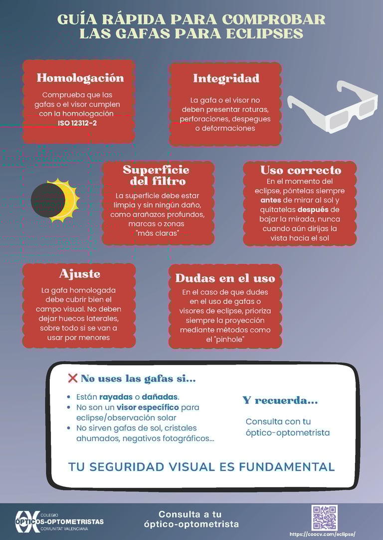 Basado en la información oficial del Colegio de Ópticos-Optometristas de la Comunidad Valenciana (COOCV), he preparado un resumen detallado estructurado en dos secciones principales para garantizar una observación segura del eclipse solar.