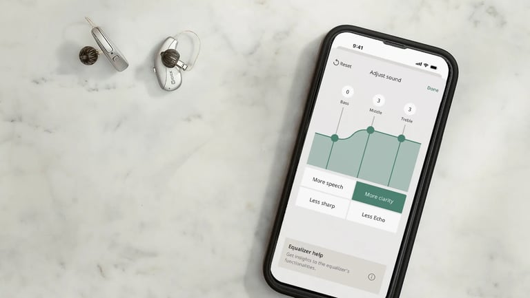 Asistente de Sonido IA: A través de una aplicación móvil, el usuario puede comparar diferentes ajustes en tiempo real. La IA guía al paciente preguntándole "¿Qué sonido prefiere, A o B?", ajustando la ecualización hasta encontrar la configuración perfecta para ese momento específico.